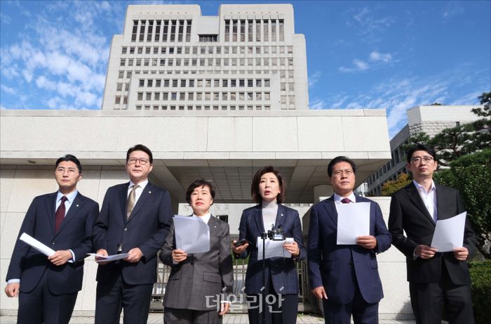 국민의힘이 대법원에서 현장 국정감사를 강행하는 더불어민주당을 향해 "우리나라의 사법질서와 법치주의를 붕괴시키고 사유화하기 위한 민주당의 교활한 사법파괴 시나리오"라고 비판했다.국민의힘 소속 법제사법위원회 위원들은 15일 서울 서초구 대법원 앞에서 기자회견을 열어, 이날 예정된 대법원 현장 국정감사에 대해 "말이 현장검증이지 본질은 대법원에 대한 물리적·심리적 압박이며 사실상 압수수색과 다름 없다. 오늘 현장검증과 국정감사는 형식도 내용도 모두 불법과 탈법의 산물"이라고 규정했다.법사위원인 나경원 의원은 "민주당 법사위, 추미애 법사…