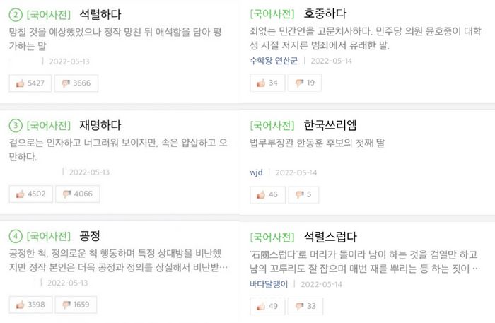 최근 더불어민주당 지지자들이 윤석열 대통령을 겨냥해 네이버 오픈사전에 '석렬하다'라는 표제어를 등재했다. 단어 등재자는 뜻풀이로 "망칠 것을 예상했으나 정작 망친 뒤에 애석함을 담아 평가하는 말"이라고 정의 내렸다. 윤 대통령과 '공정'이라는 단어를 비난적 의미로 섞은 '굥정'이라는 단어도 오픈사전 표제어 중 하나로 올랐다. 이 단어는 '윤'을 거꾸로 표기한 '굥'을 사용해 "공정한 척, 정의로운 척 행동하며 특정 상대방을 비난했지만 정작 본인은 더욱 공정과 정의를 상실해 비난받을 행동을 했을 때 쓰는 말"로 풀이돼 있다.