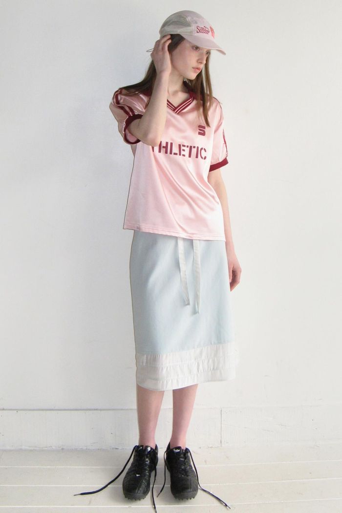 해당 제품은 ‘SPORTY TRACK HALF SLEEVE SHIRTS-PINK’로 소프트한 컬러감이 매력적이다. 특히 광택감 있는 소재로 시원하면서도 영롱한 느낌을 연출해낸다. 플래시를 터뜨려 사진을 찍을 때 더욱더 힙한 무드를 나타낼 수 있을 것 같은 제품으로, 루즈핏으로 여유롭게 착용 가능한 점 또한 매력적으로 다가온다.