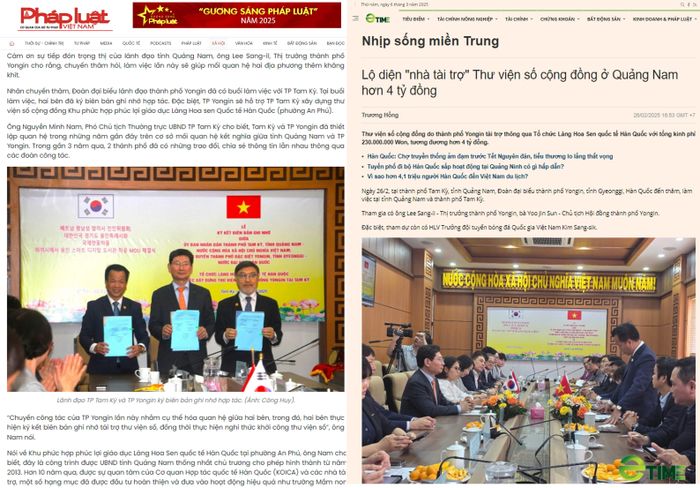 베트남 법률신문(왼쪽)과 베트남이타임즈에 게재된 이상일 시장 방문과 땀끼시 스마트도서관 건립 지원 기사.ⓒ 용인시 제공