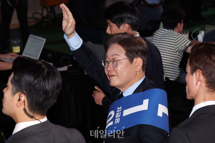 19일 충북 청주 서원구 청주체육관에서 열린 충청권 권리당원(대의원 포함) 온라인 투표 결과 발표 후, 공고한 '1강'을 확인한 이재명 전 대표는 기자들을 만나 "새로운 나라를 만들어 가라는 열망을 잘 받겠다"고 밝혔다.