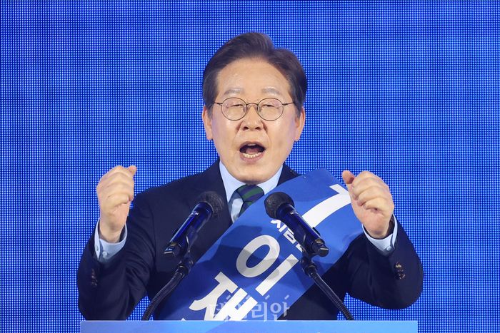 이재명 더불어민주당 대선 경선 후보가 19일 오후 충북 청주 서원구 청주체육관에서 열린 민주당 21대 대선 후보 선출을 위한 충청권 합동연설회에서 연설을 하고 있다. ⓒ데일리안 홍금표 기자