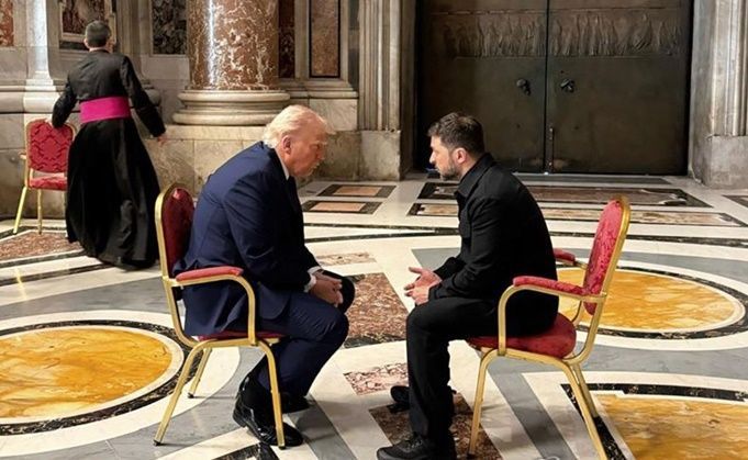 트럼프 대통령과 젤렌스키 대통령은 전날 프란치스코 교황 장례 미사가 열리기 전 바티칸 성 베드로 내부에 의자를 놓고 앉아 ’15분 간 독대’했다. 이들 정상의 만남은 지난 2월 말 백악관 집무실에서 고성으로 언쟁을 벌이는 바람에 회담이 파행을 겪은 이후 처음으로 이뤄졌다. 우크라이나 전쟁 종식을 위한 협상에서 매우 중요한 시점에 성사됐다.