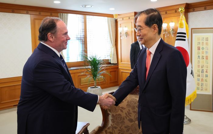 한덕수 대통령 권한대행 국무총리가 30일 정부서울청사에서 존 펠란 미국 해군성 장관을 접견, 악수하고 있다. ⓒ국무총리실