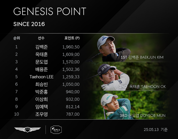 ‘KPGA 클래식’에서 3위에 자리한 옥태훈(27.금강주택)이 지난주 제네시스 포인트 4위에서 2계단 뛰어오른 2위, ‘제44회 GS칼텍스 매경오픈’ 챔피언 문도엽(34.DB손해보험)이 3위, ‘KPGA 클래식’에서 통산 2승을 달성한 배용준(25.CJ)가 4위, ‘2025 우리금융 챔피언십’ 우승자 이태훈(35.캐나다)이 5위에 이름을 올렸다.