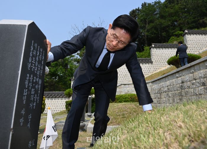 김문수 국민의힘 대선 후보가 28일 오전 경남 창원시 마산회원구 국립3·15민주묘지에서 김주열 열사 묘를 참배하고 있다. ⓒ데일리안 방규현 기자