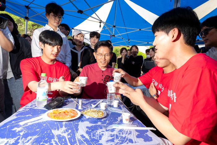 김문수 국민의힘 대선 후보가 28일 오후 경북 경산시 영남대학교를 방문해 축제 현장에서 학생들과 대화를 나누고 있다. ⓒ데일리안 방규현 기자