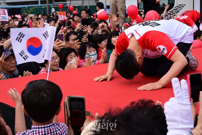 김문수 국민의힘 대선 후보가 28일 오후 경북 영천시 영천역 광장에서 열린 유세에서 시민들에게 큰절하고 있다. ⓒ데일리안 방규현 기자