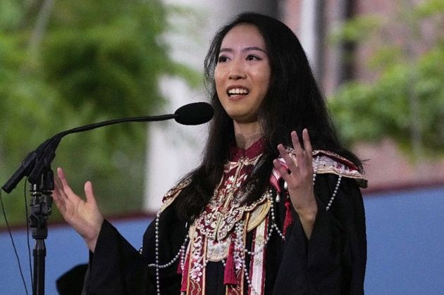 지난달 29일 미국 매사추세츠주 케임브리지의 하버드대 졸업식에서 중국 유학생 장위룽이 졸업 연설을 하고 있다. ⓒ AP/뉴시스