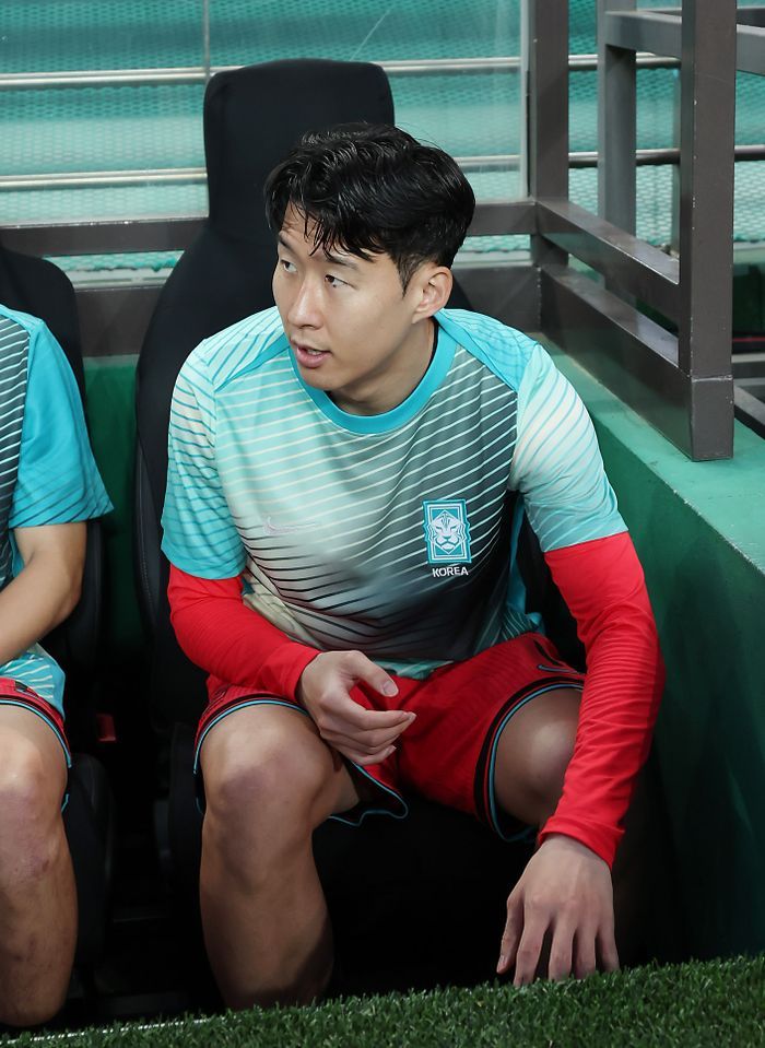 10일 서울월드컵경기장에서 열린 2026 국제축구연맹(FIFA) 북중미월드컵 아시아 3차 예선 한국과 쿠웨이트의 경기 전 손흥민이 벤치에 앉고 있다. ⓒ 뉴시스