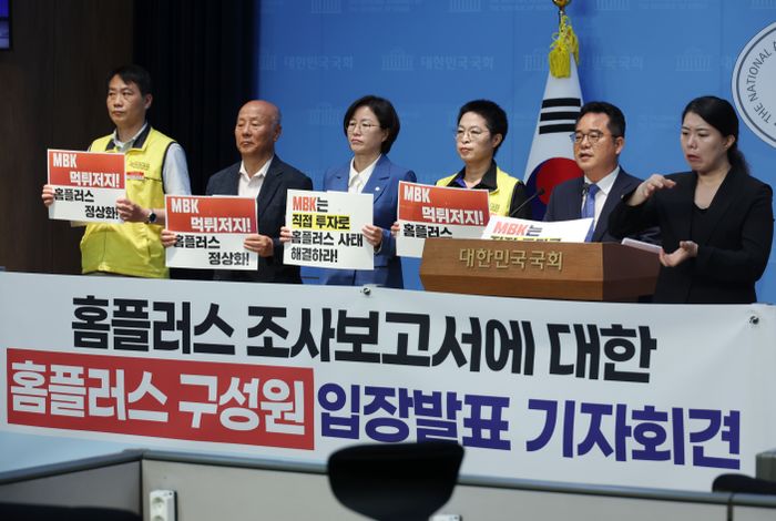 13일 홈플러스 사태 해결 공동대책위원회가 서울 여의도 국회 소통관에서 홈플러스 조사보고서에 대한 홈플러스 구성원 입장발표 기자회견을 하고 있다.ⓒ뉴시스