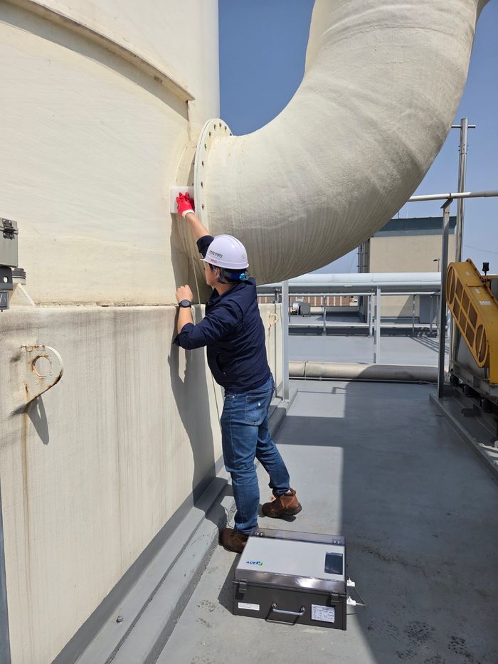 인천환경공단 관계자가 중구 송산 하수처리시설 고농도 악취방지시설의 유입악취 점검 및 포집하고 있다.ⓒ 인천환경공단 제공