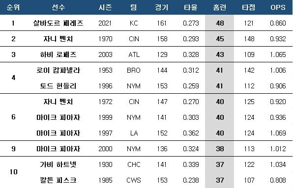 포수 한 시즌 최다 홈런은 2021년 살바도르 페레즈(캔자스 시티)가 작성했다. 당시 페레즈는 48개의 홈런을 기록하며 1970년 자니 벤치의 45개를 넘어섰다. 다만 페레즈의 경우 161경기 중 40경기를 지명타자로 나오며 컨디션 관리를 받았고, 그 결과 역사적인 기록 달성에도 불구하고 MVP 투표에서 7위에 머물고 말았다.