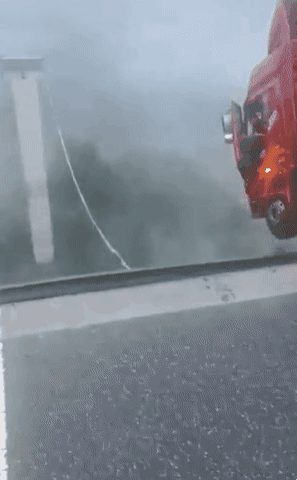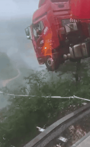 집중호우로 발생한 산사태로 한 화물차가 무너진 다리 끝에 매달린 모습이 담긴 영상이 공개돼 화제다.