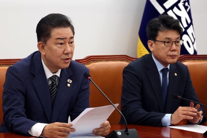 김병기 더불어민주당 당대표 직무대행 겸 원내대표가 3일 오전 서울 여의도 국회에서 열린 정책조정회의에서 발언을 하고 있다. 오른쪽은 진성준 정책위의장. ⓒ뉴시스