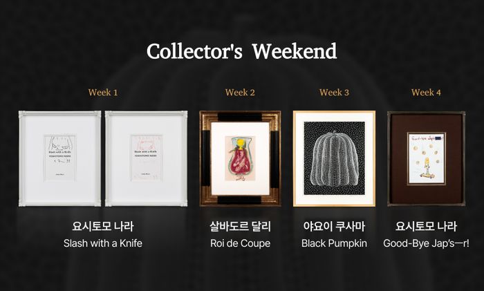 업비트 NFT는 오는 4일부터 한 달간 매주 금요일마다 총 4회에 걸쳐 '컬렉터스 위크엔드(Collector’s Weekend)' 프로젝트를 진행한다. 이번 드롭스는 ▲7월 4일 요시토모 나라의 Slash with a Knife ▲7월 11일 살바도르 달리의 Roi de coupe ▲7월 18일 야요이 쿠사마의 Black Pumpkin ▲7월 25일 요시토모 나라의 Good-Bye Jap'sㅡr! 순으로 진행된다.