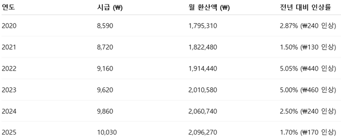 2020년부터 2025년까지의 최저임금 및 인상률. ⓒChatGPT