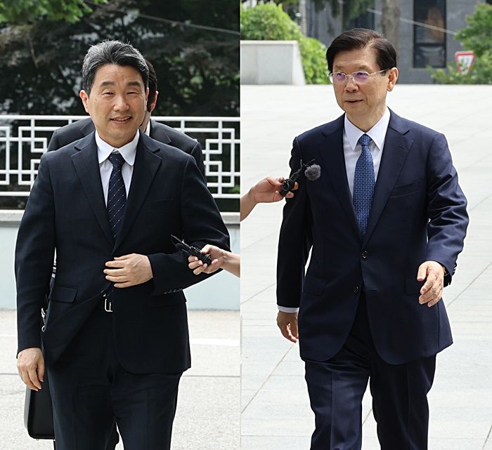 이주호 교육부 장관(사진 왼쪽)과 박종준 전 대통령경호처장이 4일 내란특검 조사를 받기 위해 특검 조사실이 마련된 서울고등검찰청으로 향하고 있다. ⓒ연합뉴스