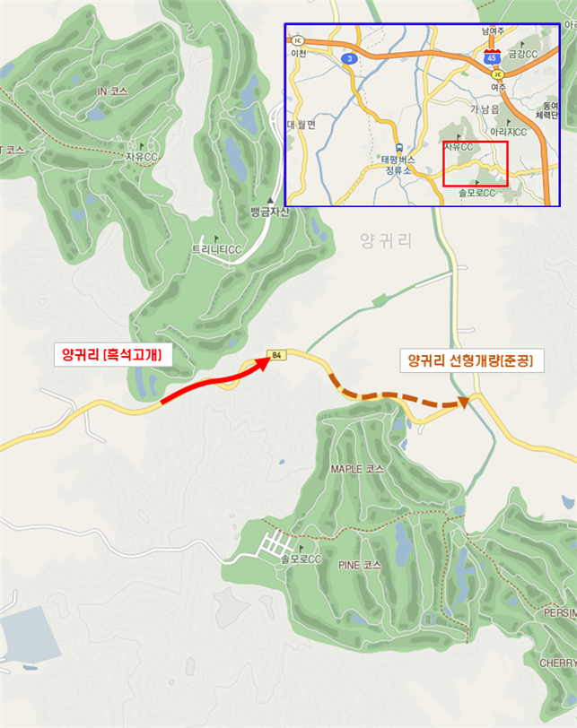 경기도건설본부는 여주시 가남읍 심석리와 양귀리를 연결하는 국지도 84호선 흑석고개 구간의 선형을 개선하는 ‘양귀리(흑석고개) 선형개량공사’를조기 준공했다고 7일 밝혔다.