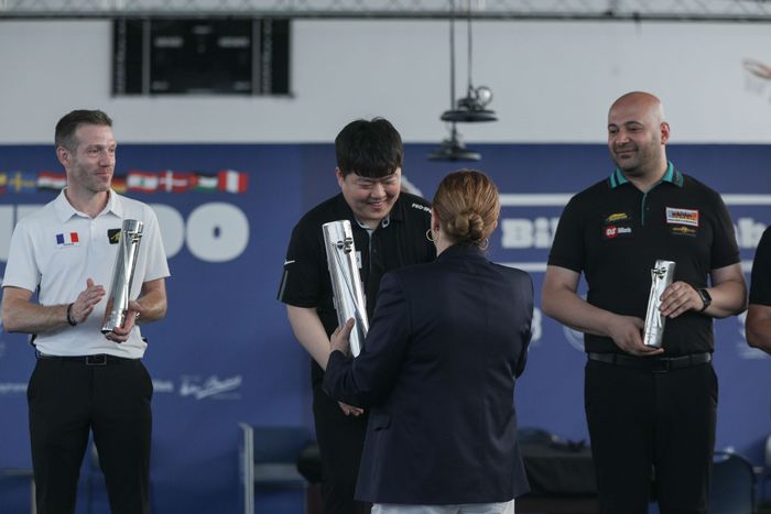 ‘2025 포르투 3쿠션 월드컵’에서 우승을 차지한 조명우가 시상대 맨 위에서 트로피를 전달받고 있다.