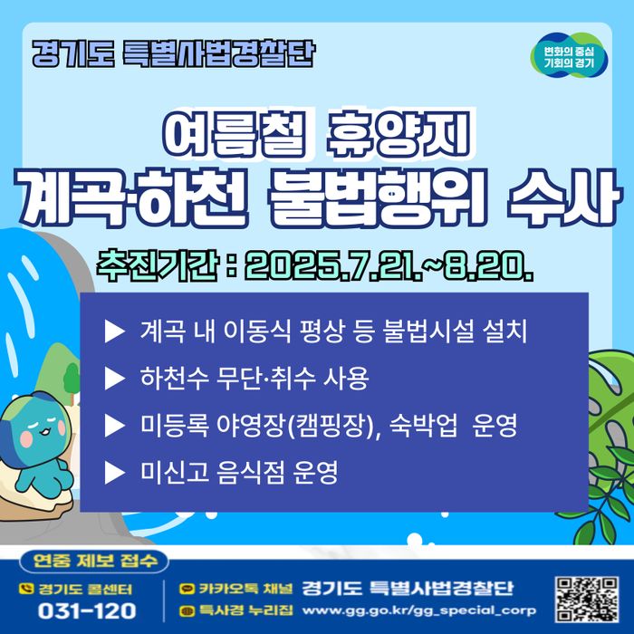기이도 경기도 특별사법경찰단장은 “도민의 안전과 쾌적한 휴양환경 조성을 위해 계곡·하천 불법행위 수사를 실시하게 됐다”며 “법률 위반 사항이 발생하지 않도록 업주 대상 안내와 예방 활동도 병행해 도민들이 안전하고 쾌적한 여름 휴가를 보낼 수 있도록 최선을 하겠다”고 강조했다.