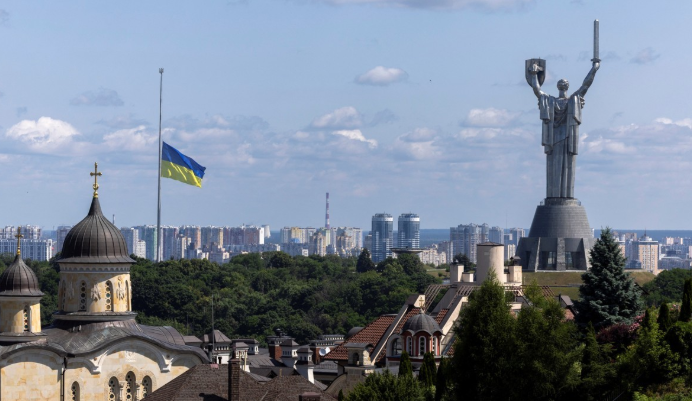 우크라이나 수도 키이우에 공습 희생자들을 애도하기 위한 조기가 걸려 있다. ⓒ로이터/연합뉴스