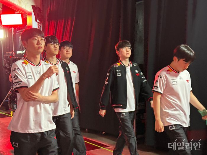 12일(현지시간) 캐나다 밴쿠버 퍼시픽 콜리시엄에서 열린 2025 미드 시즌 인비테이셔널(MSI)에서 T1 선수단이 3세트 종료 후 이동하고 있다. ⓒ데일리안 황지현 기자