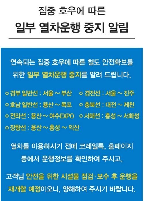코레일, 서울∼대전 등 일반열차 일부 운행 중지…충남 당진천 범람 등 '집중 호우' 여파