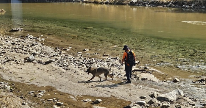 이달 24일 경기 가평군 상면 덕현리 수해 현장에서 강원특별자치도소방본부 특수대응단 119구조견 가온이 핸들러와 수색 작업을 벌이고 있다. ⓒ강원특별자치도소방본부
