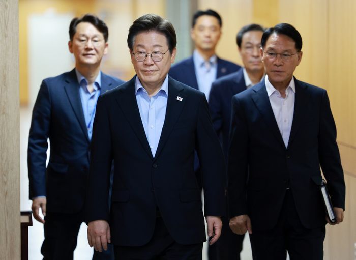 이재명 대통령이 31일 서울 용산 대통령실 청사에서 열린 수석·보좌관회의에 입장하고 있다. ⓒ뉴시스