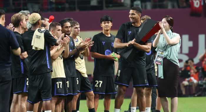 2025 FC바르셀로나 아시아투어–FC서울 친선경기가 31일 오후 서울월드컵경기장에서 열렸다. 경기가 끝나고 FC바르셀로나 선수들이 트로피를 받고 기뻐하고 있다. ⓒ데일리안 방규현 기자