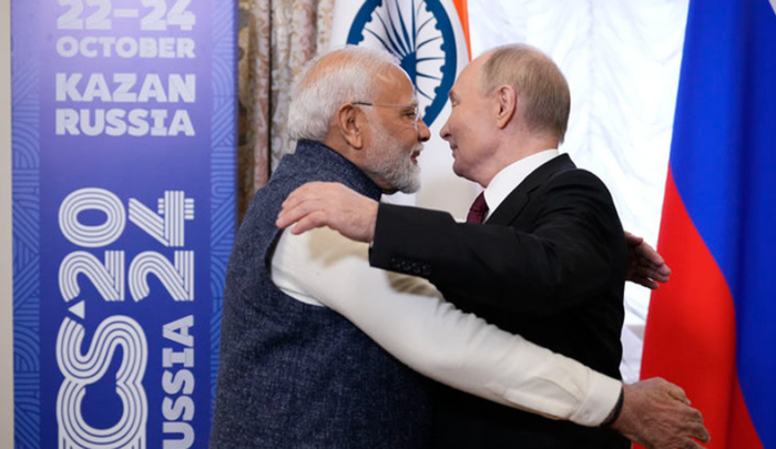 나렌드라 모디(왼쪽) 인도 총리와 블라디미르 푸틴 러시아 대통령이 지난해 10월 22일 러시아연방 타타르공화국에서 열린 브릭스 정상회의에 참석해 포옹하고 있다. ⓒAP/뉴시스