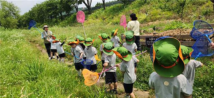 지난 6월 17일 성남지역 어린이집 원아들이 탄천 태평습지생태원에서곤충을 채집·관찰하고 있는 모습. ⓒ성남시 제공