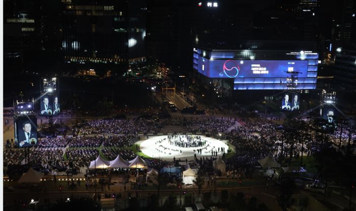 이재명 대통령이 15일 오후 서울 종로구 광화문 광장에서 열린 '광복 80년, 국민 주권으로 미래를 세우다' 제21대 대통령 국민 임명식에서 국민임명장을 받은 후 감사인사를 하고 있다. ⓒ뉴시스