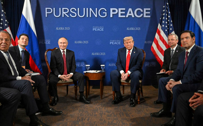 도널드 트럼프(오른쪽) 미국 대통령과 블라디미르 푸틴 러시아 대통령이 지난 15일 미국 알래스카주 앵커리지에서 정상회담 전 기념 촬영을 하고 있다. ⓒAP/뉴시스