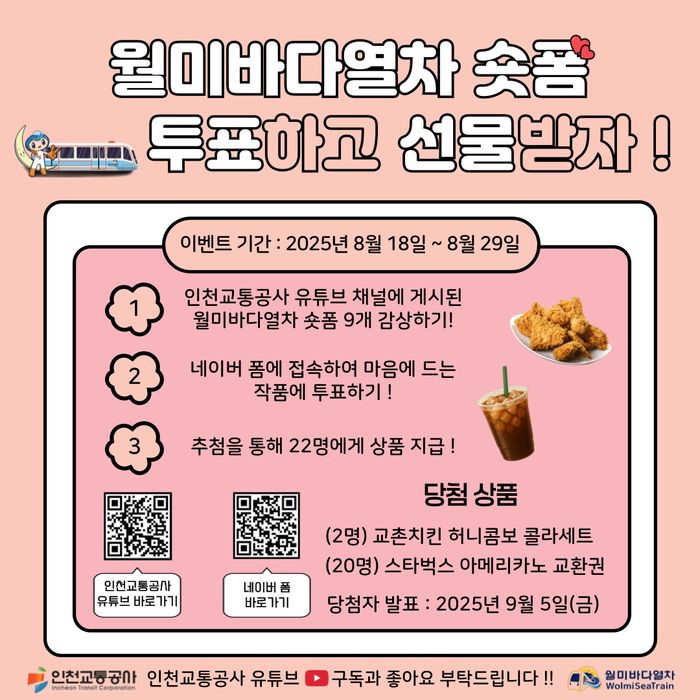 시민 투표에 참여하려면 인천교통공사 유튜브 채널에 게시된 9편의 숏폼 영상을 감상한 후, 네이버폼에 접속해 가장 마음에 드는 작품을 선택하면 된다. 투표 참여자 중 추첨을 통해 소정의 경품도 제공된다.