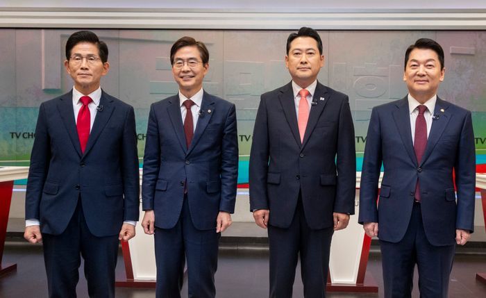 국민의힘 김문수(왼쪽부터), 조경태, 장동혁, 안철수 당 대표 후보가 지난 19일 오후 서울 중구 TV조선 스튜디오에서 열린 ‘당 대표 후보자 TV토론회’ 에 참석해 포즈를 취하고 있다. ⓒ 뉴시스