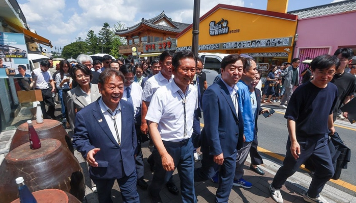 정 대표는 등줄기에 땀이 줄줄 흐르는 35도의 무더운 날씨에도 30분 이상 황리단길을 걸으며 시민들에게 눈도장을 찍었다. 얼굴이 굵은 땀방울로 범벅이 됐지만 더위에 지친 기색을 애써 감추며 민생투어 일정을 끝까지 소화했다.