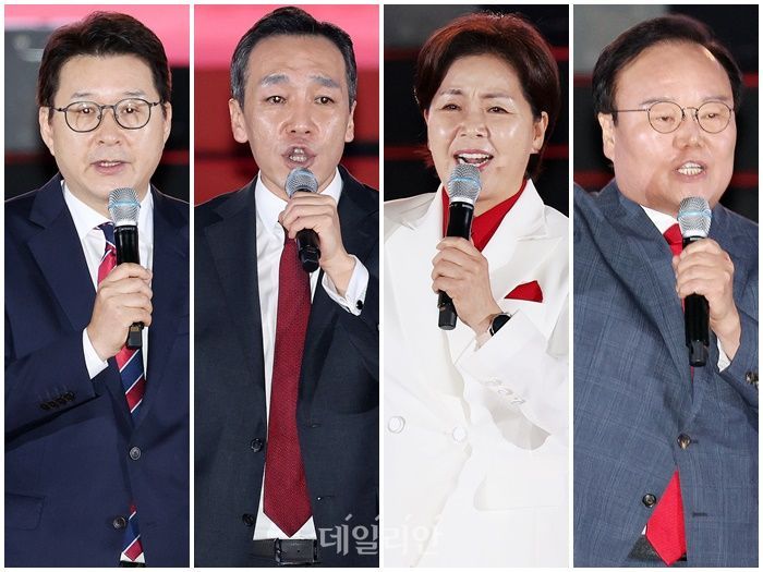 국민의힘은 22일 충북 청주 오송에 위치한 오스코에서 8·22 전당대회를 열어 신동욱·김민수·양향자·김재원 후보를 새 최고위원으로 선출했다. 청년최고위원으로는 우재준 후보가 당선됐다. 최고위원과 청년최고위원은 본선으로만 선출되는 만큼 이날 당선자들은 오는 26일 새 당대표가 뽑히는 즉시 최고위원회에 들어가 당의 지도부로 활약하게 된다.