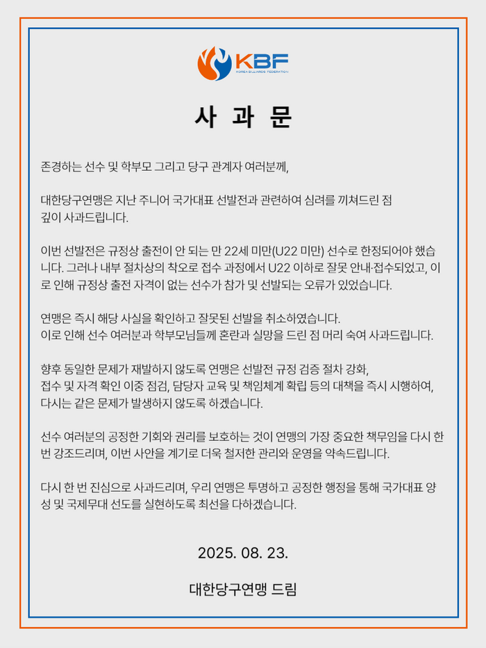 대한당구연맹은 지난 8월 18일~19일 개최된 ‘제16회 세계 주니어 3쿠션 선수권 대회 대표선수 선발전’과 관련해 추가 선수 선발 과정에서 발생한 오류에 대해 공식적으로 사과의 입장을 밝혔다.