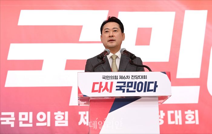장동혁 국민의힘 신임 당대표가 26일 오전 서울 여의도 국회 도서관 대강당에서 열린 국민의힘 제6차 전당대회 결선에서 수락연설을 하고 있다.