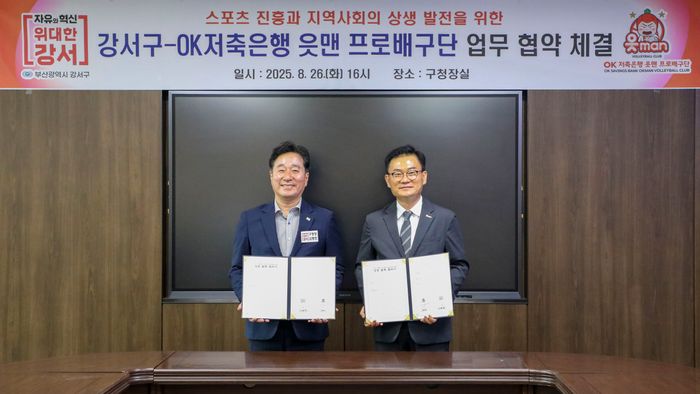 OK저축은행 읏맨 프로배구단(이하 OK 읏맨 배구단, 구단주 최윤)은 26일 부산시 강서구와 원활한 홈 경기 운영및 지역 활성화를 위한 업무협약(MOU)을 체결했다고 27일 밝혔다.