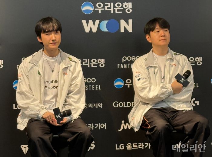 '피넛' 한왕호(왼쪽)와 최인규 한화생명e스포츠 감독이 27일 서울 종로구 LCK 아레나에서 열린 2025 LoL 챔피언스 코리아 정규 시즌 5라운드 경기를 마치고 기자들에게 소감을 밝히고 있다. ⓒ데일리안 황지현 기자