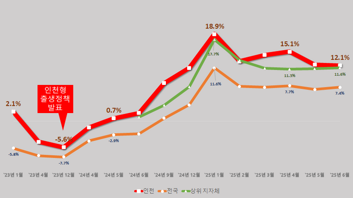 통계청이 발표한 2025년 6월 인구동향에 따르면 인천시는 1~6월까지 출생아 수가 전년 동기 대비 12.1% 증가해 전국 17개 시·도 가운데 가장 높은 증가율을 보였다.