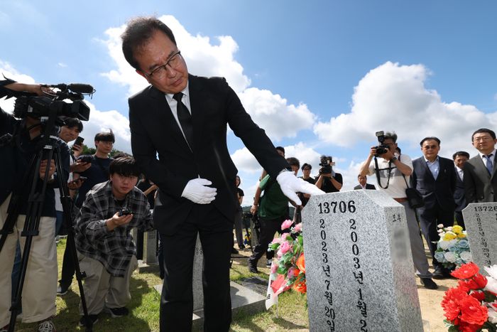 순직 해병 수사 외압 사건을 맡은 이명현 특별검사가 1일 대전 국립현충원 채상병 묘역을 참배하고 있다(뉴시스). ⓒ뉴시스