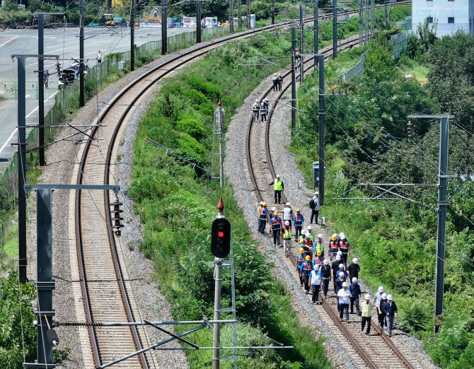 사고가 발생한 지난 19일 경북 청도군 화양읍 삼신리 청도소싸움 경기장 인근 경부선 철로에서 코레일 등 관계자들이 사고가 난 선로를 조사하고 있다.ⓒ연합뉴스