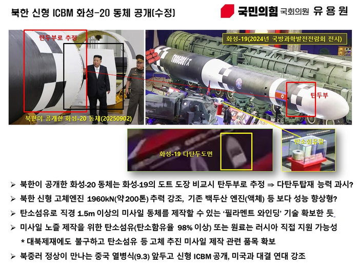 군사전문기자 출신 유용원 국민의힘 의원은 "북한이 백두산 엔진(액체) 보다 강한 것으로 추정되는 신형 고체엔진 탑재 화성-20 신형 ICBM 개발계획을 공개한 것은 북중러 정상이 만나는 중국 열병식 참가를 앞두고 미국과 대결 연대에 참가하겠다는 것을 강조한 것"이라고 밝혔다.