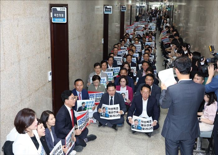 국민의힘 측은 특검 측의 압수수색 영장 집행에 강하게 반발해 원내대표실 앞에서 연좌농성을 이어가면서도 특검 측과 자료 제공을 놓고 협의를 이어간 것으로 전해졌다.