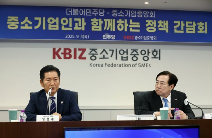 이날 간담회에는 민주당에선 정 대표를 비롯해 한정애 정책위의장, 김원이 산업통상자원중소벤처기업위원회 간사, 권칠승 중소기업특위 위원장, 김동아 산자위 위원, 권향엽 대변인, 한민수 대표비서실장, 김영환 정무실장, 임오경 민원정책실장 등이 참석했다. 중소기업계에서는 김 회장과 윤학수 대한전문건설협회장, 조인호 대한기계설비건설협회장, 박창숙 한국여성경제인협회장, 강환수 중소기업융합중앙회장, 김덕재 IT여성기업인협회장 등이 자리했다.