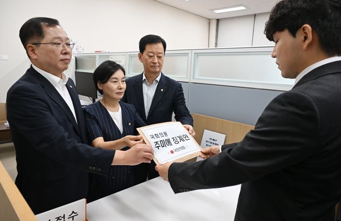 조승환·서명옥 국민의힘 원내부대표, 최은석 원내수석대변인(사진 왼쪽부터)이 5일 오전 국회 의안과에서 추미애 법제사법위원장에 대한 징계안을 제출하고 있다. (공동취재) ⓒ뉴시스
